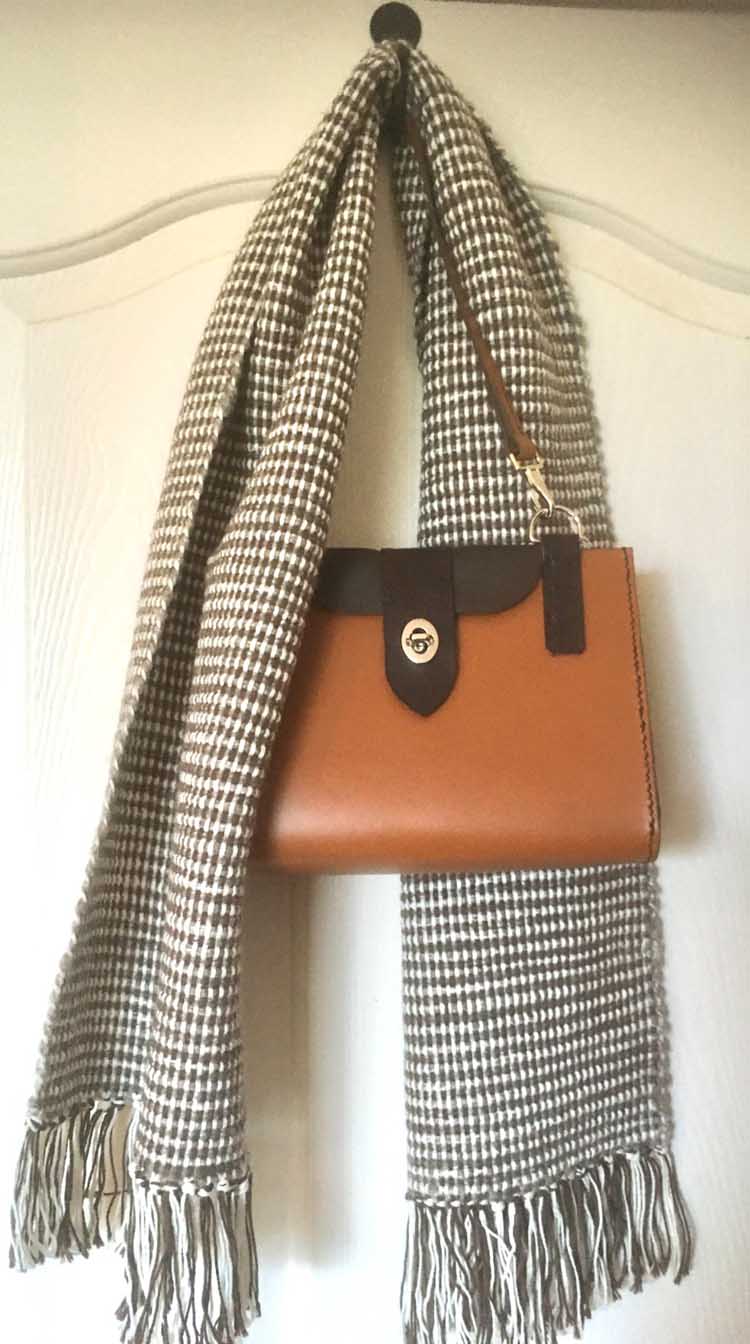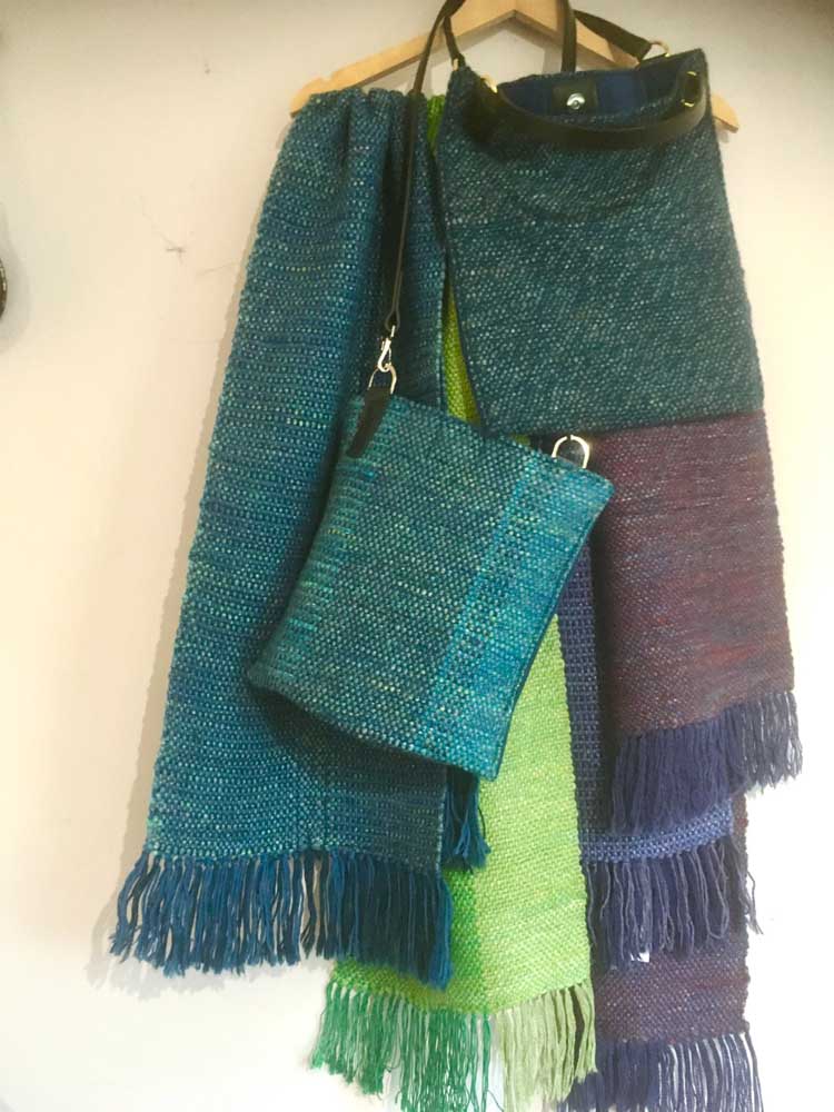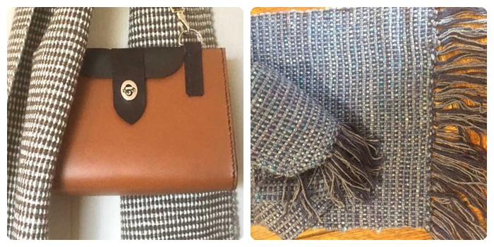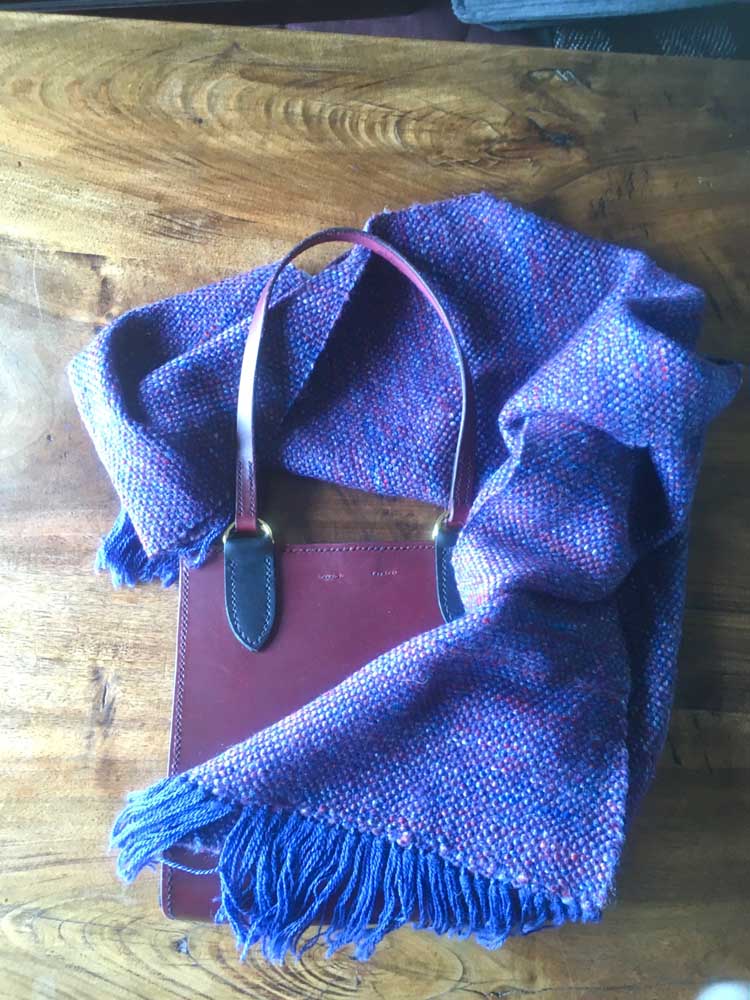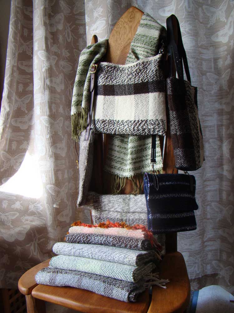 Using the finest quality sheep and alpaca wool and silk she creates unique yarns which are then hand woven into one-off fabrics and items with hand powered equipment in Llwyngwril, North Wales. Designing and creating the yarns is one of the chief joys for Jo, though each being unique makes it difficult when asked for a duplicate! She uses 100% natural materials, organically produced wherever available. Some of the yarn is bought ready spun and this is always organic. This makes the items produced as carbon neutral as possible. She qualified as a harness maker in the 1990’s and although her hands are not up to that anymore, the skills and tools are useful for handmade leather bags and the straps of fabric ones.