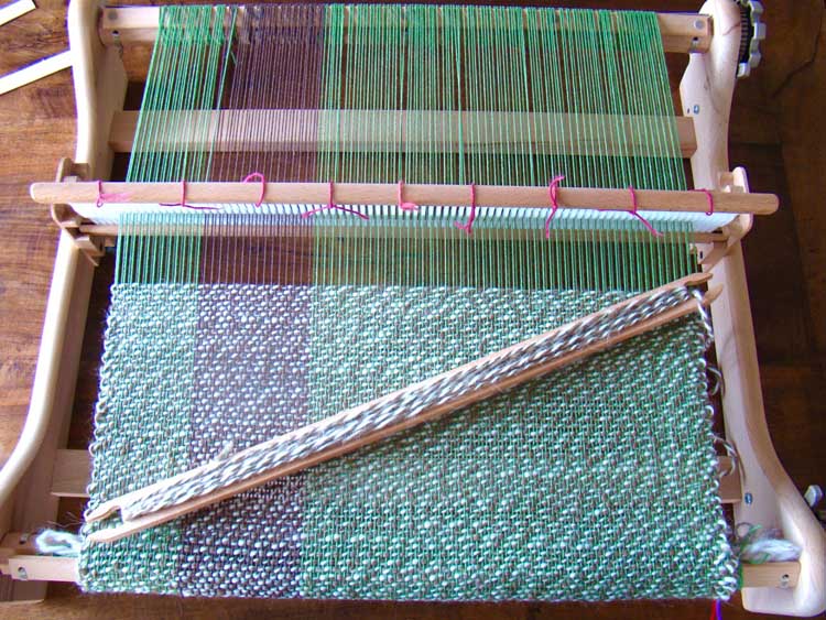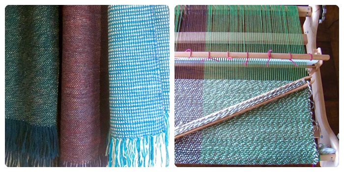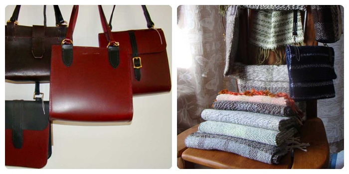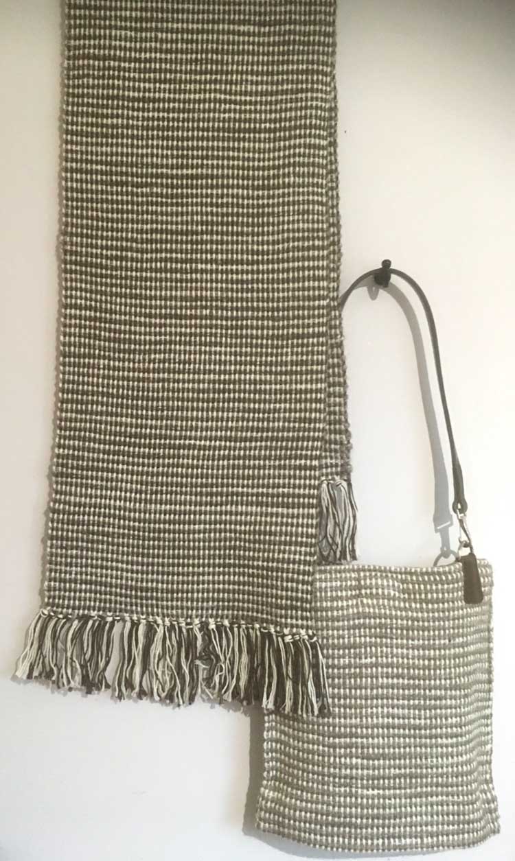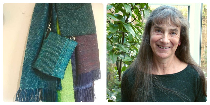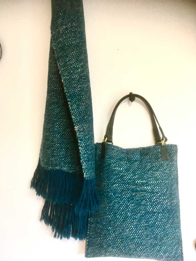 Using the finest quality sheep and alpaca wool and silk she creates unique yarns which are then hand woven into one-off fabrics and items with hand powered equipment in Llwyngwril, North Wales. Designing and creating the yarns is one of the chief joys for Jo, though each being unique makes it difficult when asked for a duplicate! She uses 100% natural materials, organically produced wherever available. Some of the yarn is bought ready spun and this is always organic. This makes the items produced as carbon neutral as possible. She qualified as a harness maker in the 1990’s and although her hands are not up to that anymore, the skills and tools are useful for handmade leather bags and the straps of fabric ones.
