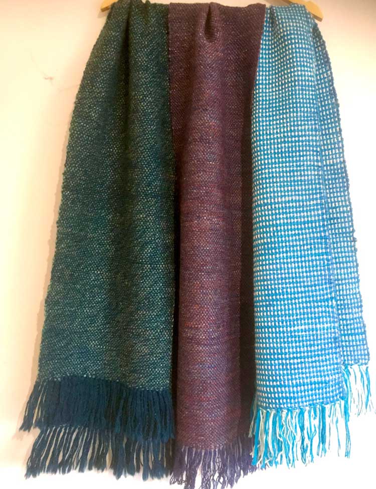 Jo has been spinning wool for more than 40 years, for most of that time using wool from her own organically raised Hebridean sheep and organic wool from other breeds as well as speciality fibres such as alpaca and mohair. These were so hard to come by at then beginning, so she produced cashmere and mohair herself on her farm in Wiltshire, although not very successfully! Fortunately, it is easier to get the raw product these days so, as a retirement project, she taught herself to weave (and is still experimenting and learning!) and continues to spin much of the yarn by hand.