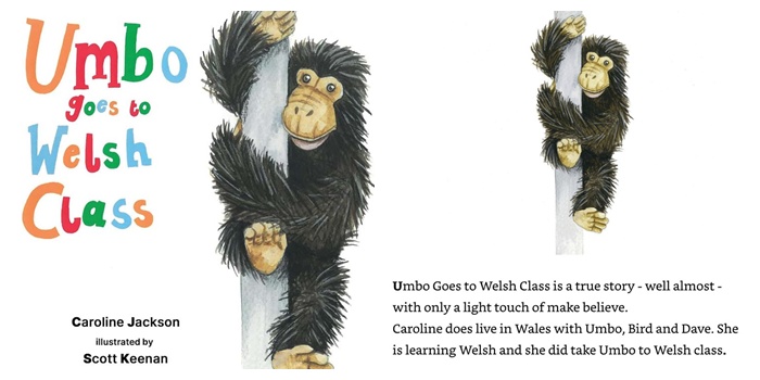 This is a true story – well, almost – with only a light touch of make believe. Caroline does live in Wales with Umbo, Bird and Dave, and she did take Umbo to Welsh class!